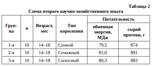 Для исследования использования питательных веществ рациона и продуктивности мясного скота в зависимости от типа кормления был проведен второй научно-хозяйственный опыт в НАО ПЗ «Кировский» (табл. 2).