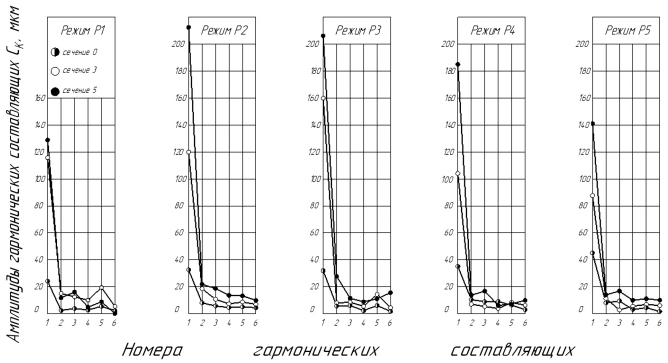 Диаграммы амплитуд гармонических составляющих, представленные на рис. 4, даны по сечениям обрабатываемых образцов 0, 3 и 5. Качественно они подтверждают ранее полученные результаты о росте величин амплитуд всех СК по мере увеличения длины отверстия в результате переноса (копирования) погрешности и о наибольшем удельном весе первых трех гармонических составляющих в суммарной погрешности формы отверстия в поперечном сечении (∆фпрод) [7, 8]. Количественно видно, что для всех режимов (рис. 4) амплитуды С4, С5, С6 (в сечениях 0…5) находятся в пределах 2…13 мкм; С2, С3 — в пределах 4…16 мкм. Лишь на режимах Р2 и Р3 в сечении 5 амплитуда составила С2 = 20…28 мкм. Существенная разница наблюдается в величинах амплитуд первой гармонической составляющей. На заходном участке наибольшая величина С1 = 46 мкм получена при SM = 74,5 мм / мин (0,047 об / мин), в остальных случаях для сечения 0 C1 = 22…34 мкм. Резкий рост величины амплитуды C1 и увеличение степени копирования погрешности по длине сверления наблюдается при увеличении подачи (от 1-го к 5-му сечению). Так, на режимах Р2 и Р3 в сечениях 0, 3 и 5 амплитуды C1 составили соответственно 35; 121; 232 мкм — в первом случае и 33; 160; 229 мкм — во втором случае. На других режимах (Р1, Р4, Р5), где подача SM = 30 мм / мин (от 1-го к 5-му сечению), степень копирования погрешности меньше и составляла в сечениях 0, 3, 5 C1 = 26…46; 88…115; 132…183 мкм. Меньшие значения амплитуд C1 соответствуют, как правило, условиям сверления на режиме Р1.