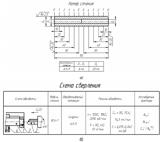 После сверления отверстие измеряли по его длине в шести сечениях, имеющих номера от 0 до 5. Сечение 0 брали у входного торца отверстия, остальные — с интервалом 10 мм от него (рис. 1, а).