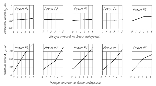 Величина радиального биения на участке врезания (0…10 мм) составила максимально ∆p. б.= 100…125 мкм на всех режимах обработки (рис. 3, б). Далее, изменяя величину минутной подачи по длине отверстия, получили наименьшее радиальная биение ∆p. б.= 265 мкм в сечении 5 при подаче SM = 30 мм / мин (режим Р5), наибольшее — ∆p. б. = 400 мкм также при SM = 30мм / мин (режим Р1). Причиной же такого расхождения явилась меньшая величина копирования погрешности в случае изменения минутной подачи от 74,5мм / мин до 30мм / мин (режим Р5) по длине отверстия, чем при сверлении с постоянной подачи SM = 30мм / мин (режим Р1). Для режимов Р2, Р3 и Р4 величина радиального биения получена на 60…85 мкм выше, чем на режиме Р5.