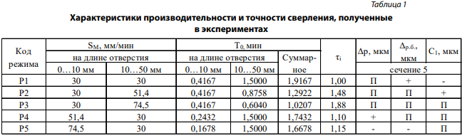 За исходный принимали вариант обработки с кодом режима Р1 (табл. 1), где Sм = 30 мм / мин (0,019 мм / об); V = 40м / мин (1582 об / мин). Для остальных случаев (код режима Р2, Р3, Р4, Р5) режимы обработки указаны в табл. 1. Режим резания по длине отверстия изменяли целенаправленно.