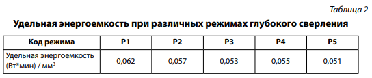 Для сравнительной оценки энергетической составляющей метода глубокого сверления был произведен расчет удельной энергоемкости. Данный критерий определяет энергоемкость воздействия, необходимую для формирования одного кубического миллиметра детали. То есть необходимо общую энергию процесса разделить на объем образующейся детали. Удельная энергоемкость служит, по сути, физическим показателем эффективности процесса резания, если в результате этого процесса стружкообразование осуществляется с приемлемой производительностью при обеспечении заданного периода стойкости инструмента, а обработанные поверхности получаются с требуемой формой, размерами и качеством [9].