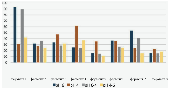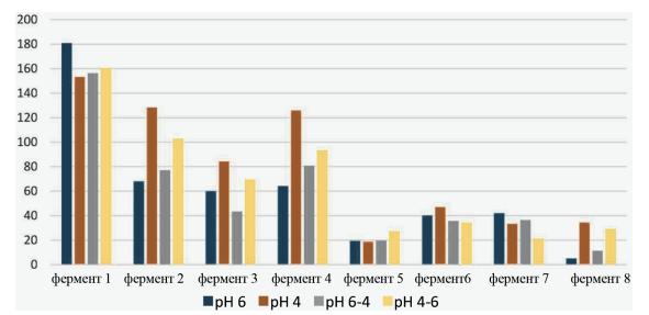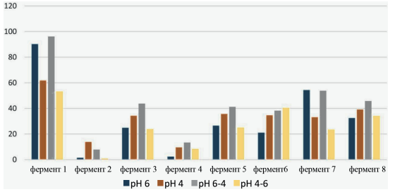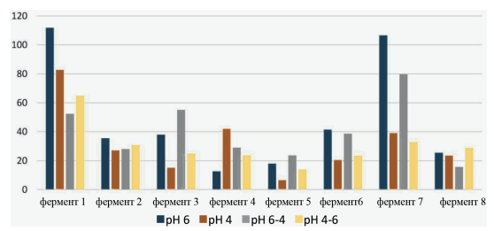 Различные субстраты проявляют разную чувствительность к изменениям рН. Для ячменя он достаточно низкий. Наибольшая разница в выделении свободных сахаров у ячменя была с ферментом 4: pH6 ~65 %, pH4 ~130 %, разница в 2 раза. Для пшеницы наибольшая разница в высвобождении свободных сахаров была с ферментом 7: pH4–6 ~35 %, pH6 ~110 %, т. е. разница почти в 3 раза.