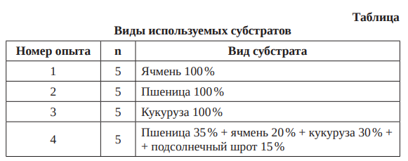 В качестве контроля использовали тоже измельченное зерно, залитое такими же буферами, но без добавления ферментов. Эффективность определялась по приросту количества выделенных сахаров под действием разных мультиэнзимных продуктов к контролю, выраженное в процентах. Контроль был принят за 100 %. Из зерновых, применяемых в кормлении, мы использовали пшеницу, ячмень, кукурузу (все зерно было предыдущего урожайного года более 6 мес хранения) и зерносмесь, состоящую из пшеницы – 35 %, ячменя – 20 %, кукурузы – 30 %, жмыха подсолнечного – 15 % (табл.).