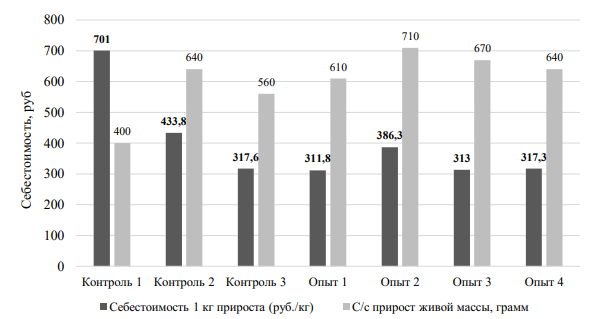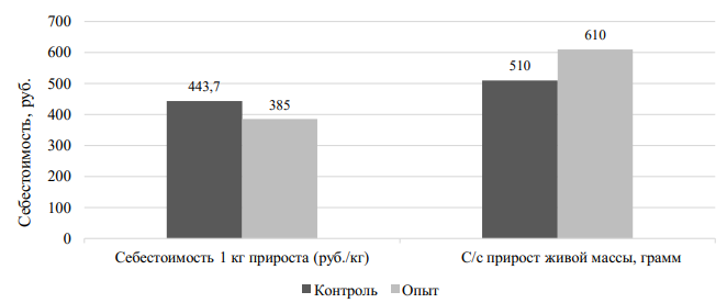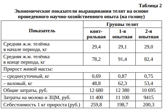 Валовый прирост в первой опытной группе оказался выше, чем в контрольной, на 13,5 кг, а во второй – на 4,2 кг. При этом затраты на выпойку телят с применением ЗЦМ в опытных группах были ниже. Так, себестоимость 1 кг прироста в первой опытной группе оказалась ниже, чем в контрольной, на 30 %, а во второй – на 29 %.