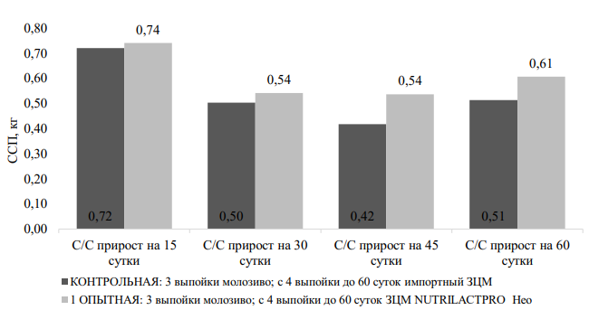 На конец опыта ССП телят опытной группы превосходил контроль на 0,1 кг, или на 19,6 % при всем том, что себестоимость 1 кг прироста в опытной группе была ниже на 15,3 %. Исходя из данных по валовому и среднесуточному приросту живой массы, растворимости, поедаемости телятами, можно резюмировать, что NUTRIL ACTPRO с 4-х суток показал превосходный результат по приросту живой массы в сравнении с импортным ЗЦМ. Таким образом, данный продукт может быть рекомендован как альтернатива цельному молоку или другим ЗЦМ премиального класса.