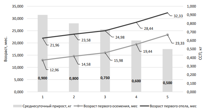 По оценкам (J. F. Ettema), затраты на выращивание телят снижаются на 18 % при снижении возраста отела с 21 до 25 месяцев. Оптимальный возраст первого отела для голштинской породы с целью получения максимальной прибыли должен составлять от 23 до 24 месяцев. Следовательно, оптимальным считается среднесуточный прирост от 730 до 900 грамм в сутки [2].
