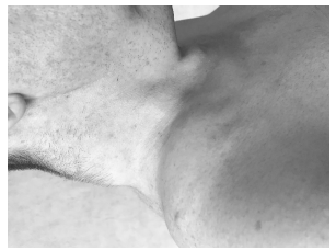 Общее состояние больного удовлетворительное. Тахикардия (пульс = 90 уд / мин), АД=125 / 80 мм рт. ст., ЧДД — 18 / мин. Удовлетворительного питания (рост 182 см, вес 74 кг). Пациент отмечает, что за последние два года похудел на 10 кг, при этом липомы в размерах не уменьшились. В области затылка — гемангиома, живота слева — «кофейное пятно», на задней поверхности шеи — линейный рубец после удаления липомы. Липомы (жировые узлы) в области передней, задней и боковых поверхностей шеи по типу «хомута» (рис. 1, 2), мягко-эластичной консистенции, легко смещаются при пальпации. На туловище и конечностях узлы отсутствуют. Гинекомастия (рис. 3). Сознание ясное, поведение спокойное, фон настроение ровный, эмоционально адекватен, держится настороженно. Речь — негрубые дисфония, дизартрия. Легкое когнитивное снижение (негрубое снижение памяти, на вопросы отвечает односложно, мышление больше конкретное). Сон достаточный. Головную боль отрицает. Позвоночник интактный, симптомы натяжения отрицательные. Ограничена подвижность шеи из-за наличия жировых узлов. Краниальные нервы: слабость конвергенции с двух сторон (больше слева); снижен слух на оба уха (больше справа); негрубые дисфония, дизартрия, глотание не нарушено, язычок отклоняется вправо, небный и глоточный рефлексы снижены; язык отклоняется вправо. Негрубые рефлексы орального автоматизма (губной, Маринеску — Родовичи с 2 сторон). Миопатический и полиневропатический синдромы: диффузная гипотрофия конечностей, гиперлордоз поясничного отдела позвоночника, походка «утиная», тетрапарез со снижением мышечной силы в проксимальных отделах конечностей до 3 баллов (с трудом приседает на корточки и встает с опорой, не может быстро подняться с низкой кровати, поднять руки выше горизонтальной линии, заложить руки за голову, отмечает, что с трудом причесывается и бреется), дистальных — до 4,0–4,5 баллов. Мышечный тонус в конечностях низкий, сухожильные и периостальные рефлексы не вызываются. Патологических кистевых и стопных знаков нет. Гипалгезия в дистальных отделах конечностей (пальцы, ладони, подошвы). Координация и статика не исследованы ввиду парезов. Мочеиспускание и дефекация не страдают.