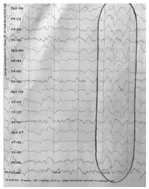 Повышен уровень трансаминаз в биохимическом анализе крови (АЛТ — 110 Ед / л, АСТ — 136 Ед / л). Стенозирующее поражение брахиоцефальных сосудов — правой внутренней сонной артерии до 60%, левой общей сонной артерии — до 45%. На МСКТ мягких тканей шеи — липомы. ЭЭГ — основной ритм коры диффузно замедлен до 6–7 Гц, выраженные диффузные дизрегуляторные изменения биоэлектрической активности головного мозга; при проведении гипервентиляционной пробы на фоне диффузного нарастания индекса медленной активности тета- и дельта-диапазона появляются короткие диффузные разряды из медленных комплексов «острая-медленная волна», частотой 2 Гц, средней амплитуды 110 мкВ с акцентом в бифронтальных отведениях (рис. 4). ЭНМГ (стимуляционная, игольчатая): дельтовидная мышца — спонтанная активность в виде потенциалов фибрилляций (ПФ), положительных острых волн (ПОВ); mm. vastus lateralis — cпонтанная активность представлена ПФ, единичными ПОВ; mm. trapezius — спонтанная активность в виде ПФ, ПОВ, единичного псевдомиотонического разряда; признаки аксонального поражения сенсорных волокон срединных и локтевых нервов (сенсорная полиневропатия); грубая сенсорно-моторная полиневропатии нижних конечностей; уменьшение средних величин длительности потенциалов двигательных единиц (ПДЕ) и амплитуды отдельных потенциалов на фоне спонтанной активности с дельтовидных и трапецевидных мышц, что свидетельствует о текущем первично-мышечном заболевании и соответствует ЭМГ-картине, наблюдаемой при миопатии; ответы с передних большеберцовых и латеральных головок четырехглавых мышц бедер указывают на невральный тип поражения. Отмечено, что во время проведения исследования у пациента при его переходе из горизонтального положения в вертикальное развился приступ общей слабости с тахикардией, одышкой, гипергидрозом, что свидетельствовало о периферической вегетативной недостаточности.