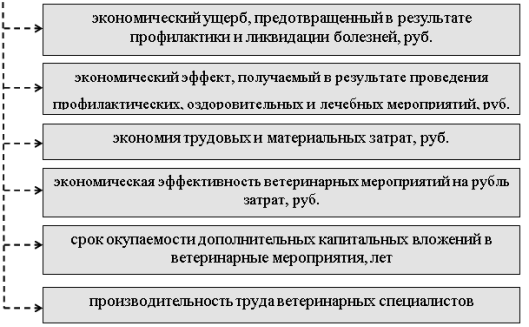 Для характеристики экономической эффективности ветеринарных мероприятий следует использовать систему показателей, представленных на рисунке 3 [4].