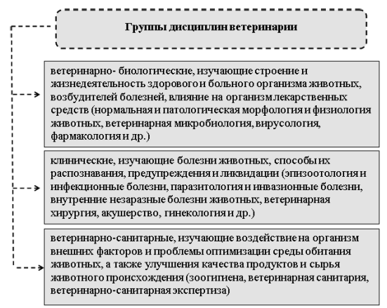 Ветеринарные мероприятия проводятся государственной ветеринарной службой либо специалистами в области ветеринарии в соответствии с требованиями ветеринарного законодательства. Определяющей категорией становится принцип научной обоснованности и экономической эффективности реализуемых мероприятий. Ветеринарная деятельность объединяет три условно выделяемые группы дисциплин (рис. 1).