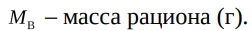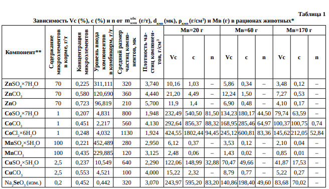 Примечание: * Компонент «носитель микроэлементов» (выделен жирным шрифтом); ** Vc (%) – коэффициент вариации распределения компонентов в рационах; с (%) – доля массы частицы Рср (г) к уровню ввода в рацион mКМПрац(г/рац.); n (%) – число рационов, в которых компоненты могут отсутствовать в зависимости от M в (г) – массы рационов корма животных.