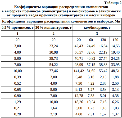 2. Любое произвольно выбранное значение коэффициента вариации распределения компонентов в выборках концентратов и премиксов