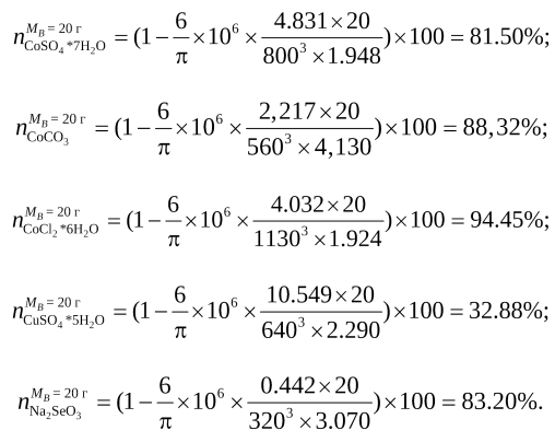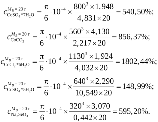Для примера рассчитаем значение с (%) в рационах MB = 20 г для следующих компонентов: CoSO4×7H2O; CoСO3; CoCl2×6H2O; CuSO4×5H2O и Na2SeO3 (смотри табл. 1):