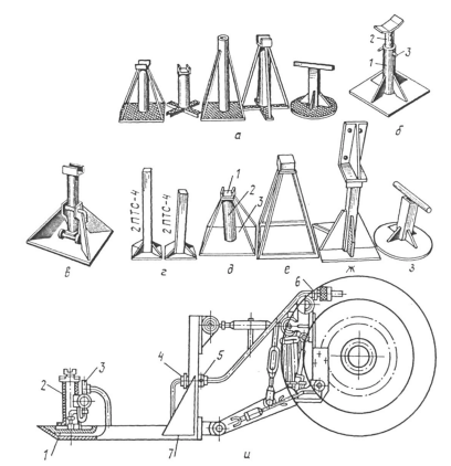 Рис. 1. Подставки под машины: а) подставки из отходов и деталей списанных машин; б) подставка, регулируемая по высоте: 1 — стойка сварная; 2 — стойка передвижная; 3 — штифт; в) подставка унифицированная ППС-87; г) маркировка подставок по их назначению; д) подставка под ось: 1 — швеллер опорный; 2 — стойка; 3 — плита опорная; е) подставка с деревянной подушкой; ж) подставка, закрепляемая к ступице колеса; з) подставка под раму; и) приспособление ОПТ-3964 для установки машин на подставки: 1 — опора; 2 — гидродомкрат; 3 — рукоятка; 4–6 — запорные устройства гидронавески трактора; 7 — рама