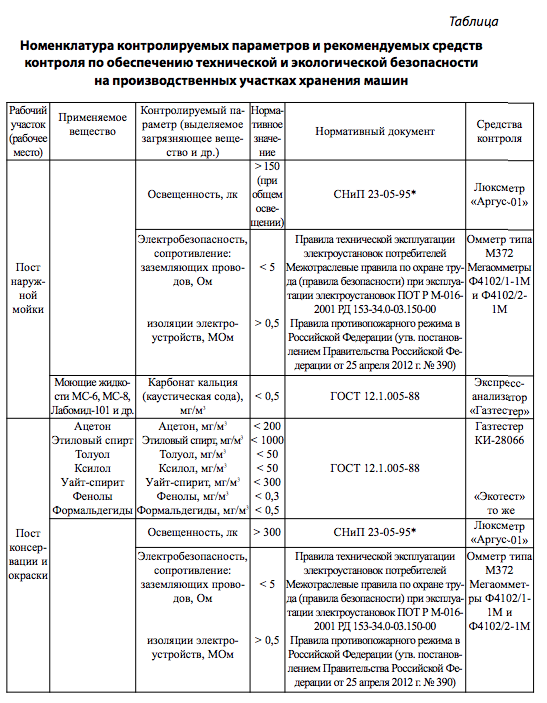 Для контроля состояния и безопасности труда в таблице дается номенклатура контролируемых параметров и рекомендуемых средств контроля по обеспечению безопасной работы.