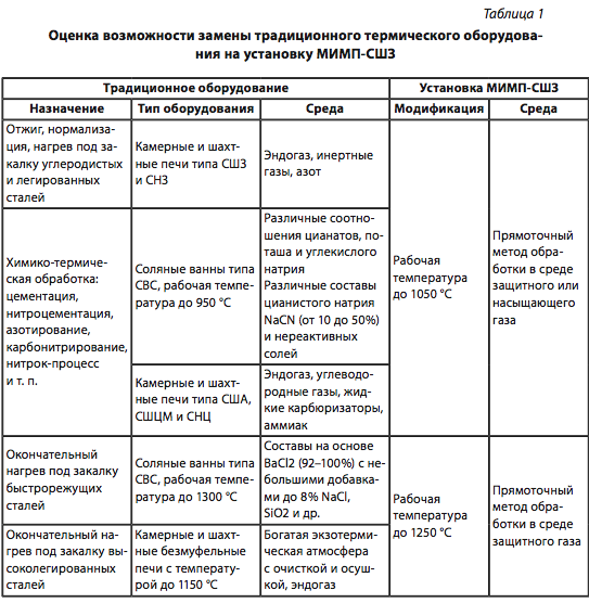 Установка МИМП-СШЗ (представляет ООО «МИУС») является многофункциональным комплексом, позволяющим проводить все наиболее распространенные виды термической и химико-термической обработки в одном рабочем пространстве. В условиях единичного и мелкосерийного производства печь может заменить 2–3 вида электротермического оборудования. Оценка возможности замены традиционного оборудования на установку МИМП-СШЗ представлена в табл. 1.