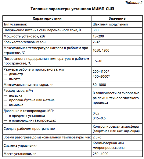 Внедрение оборудования потребует наличия сжатого воздуха, углеводородного газа (пропана-бутана или метана) и аммиака (при нитроцементации или азотировании). Типовые параметры серийно выпускаемых печей представлены в табл. 2.