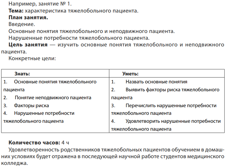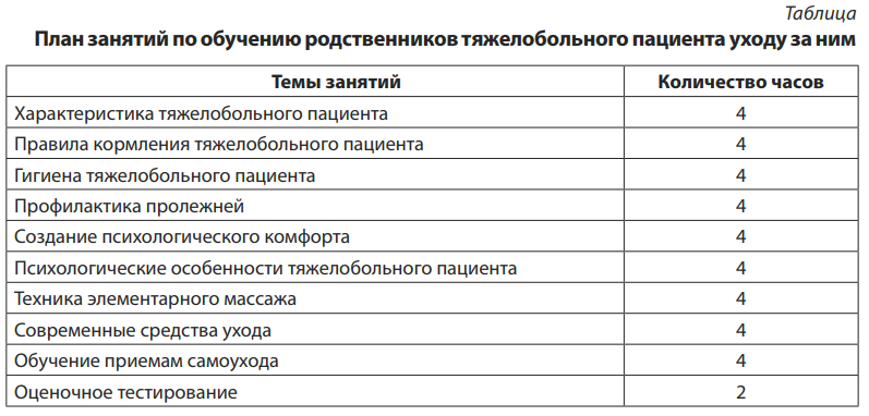 По результатам научного исследования с целью улучшения качества ухода за тяжелобольными в домашних условиях был разработан методический план занятий по обучению родственников (см. таблицу).
