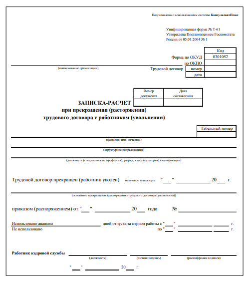 • Ф.И.О. и должность сотрудника, увольнение которого оформляется, его табельный номер и данные о структурном подразделении.
