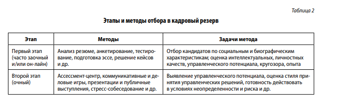На практике требуется использование дополнительных методов отбора, которые бы дали более точную комплексную оценку кандидата в резерв. Поэтому сегодня отбор в кадровый резерв – это ступенчатый отбор с использованием интерактивных методов, часто дорогостоящих по процедуре и привлечению экспертов (табл. 2).