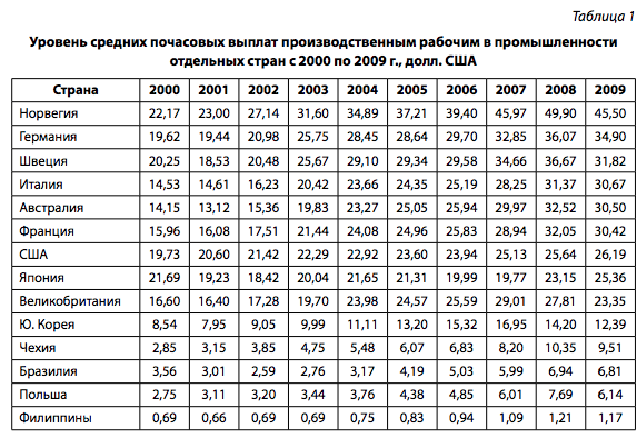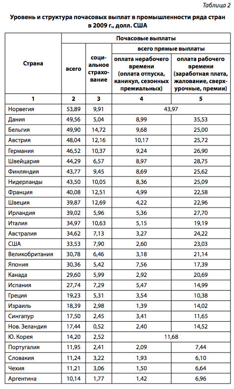 Высокими темпами растет почасовая оплата в Норвегии. За 2000–2008 гг. она увеличилась в 2,25 раза. Наиболее защищенными в социальном плане являются рабочие в Бельгии, Австрии и Германии — социальные выплаты составляют 25–30 % от общего объема выплат. Менее защищенные рабочие на Филиппинах, у них не только низкая почасовая оплата труда, но и очень скромные социальные выплаты.