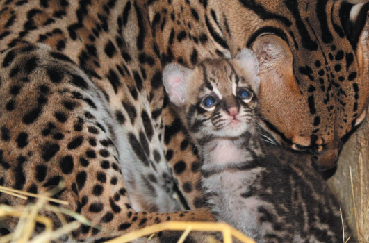 У оцелота может быть от одного до четырех детенышей, но чаще всего их бывает один или двое. Котята рождаются уже в шубке, которая более темного оттенка, чем у родителей, но они совершенно слепы, вес новорожденных достигает 250 г. Растут малыши достаточно медленно и только к трехмесячному возрасту впервые выходят из своего убежища. Котята долго живут с матерью и только ближе к двум годам начинают подыскивать себе собственную территорию для постоянного проживания.