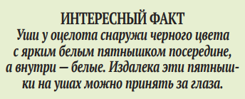 Тело оцелота грациозное, но сильное и крепкое. Лапы основательные и круглые, а сами ноги достаточно мощные и длинные. На вытянутой шее расположена аккуратная, слегка приплюснутая голова, на которой хорошо видны широко расставленные закругленные уши. Глаза у хищника очень выразительные, глубокие и немного раскосые. Они имеют янтарный цвет и выделяются на мордочке яркой черной обводкой. Кончик носа у этих кошек розовый.