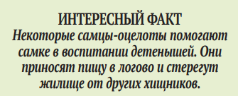 Жизненный срок оцелота, живущего в диких условиях, составляет около 14 лет, а прирученные особи при должном уходе могут прожить и четверть века.