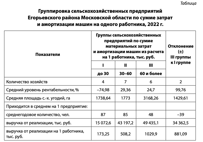 Племенная база региона по молочному скотоводству представлена голштинской, холмогорской, черно-пестрой, а также айширской породами. Основу генофонда свиней в регионе составляют следующие породы: миргородская степная белая, брейтовская, крупная белая; ливенская; кемеровская; муромская; уржумская. Романовская является основной породой овцеводства в регионе, занимающей около 50 % в общей структуре. С целью определения инновационного потенциала сельскохозяйственных предприятий Егорьевского района Московской области была использована соответствующая группировка (таблица).
