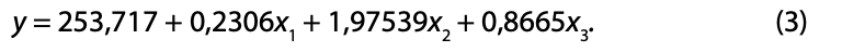 Для определения эффекта масштабности на развитие инновационной деятельности исследуемые сельскохозяйственные предприятия по показателю общей посевной площади распределены на три группы: до 1500 га (15 хозяйств); 1501–3000 (12 хозяйств); более 3001 (8 хозяйств). Для построения многофакторной корреляционно-регрессионной модели нами были взяты те же три основных факторных признака, как и в предыдущей модели. Следует отметить, что связь между факторами (х1, х2, х3) и признаком (у) в двух первых группировках имеет среднее значение. Поэтому не считаем целесообразным приводить эти расчеты. Полученное уравнение регрессии для третьей группы хозяйств имеет вид