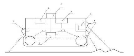 Рис. 1. Схематичная конструкция роботизированного трактора: 1 — лазерный сканер; 2 — радар; 3 — гироскоп; 4 — бортовой компьютер; 5 — навигационная система ГЛОНАСС; 6 — система управления движением; 7 — видеокамера