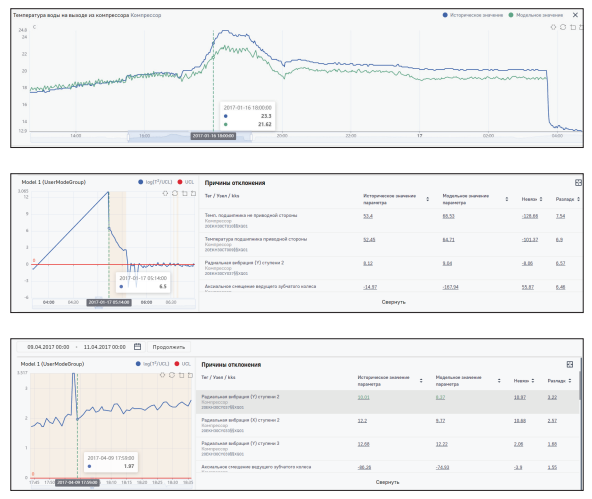 На практике результаты работы статистической модели компрессора, сигнализирующие о зарождающихся аномалиях, выглядят так: