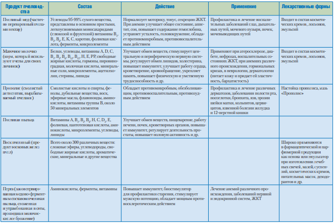 Продукты пчеловодства издавна используются людьми для лечения многих заболеваний. В качестве альтернативных и дополнительных лечебных средств они признаны и официальной медициной. Продукты пчеловодства активно включаются и в продукты, предназначенные для диетического и лечебного питания. Цель работы — описание основных свойств различных продуктов пчеловодства и форм их применения в аптечной и медицинской практике.