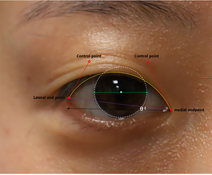 Переход от описательных наблюдений к точным правилам опирается на две группы измерений. Во-первых, EEA чутко реагирует на изменения верхнего контура и отражает «открытость» взгляда; использование EEA как контрольной метрики помогает заранее оценивать, не приведёт ли выбранная комбинация «длина×изгиб» к лишнему перекрытию оптической зоны при вертикальном взгляде [5]. Во-вторых, аппроксимация верхнего контура кривыми Безье с опорными точками по краю века воспроизводимо описывает индивидуальную форму и облегчает тиражирование шаблонов длины по дуге для сходных морфологий [8]. На рис. 1 показана схема такой аппроксимации и перечень базовых измерений, которые используются при подборе.