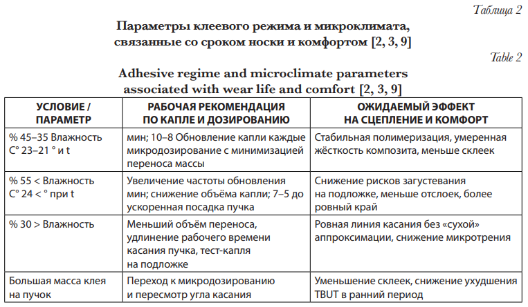 Перед внедрением регламента из табл. 2 требуется фиксация двух принципов. Во-первых, частота обновления капли и микродозирование влияют не только на долговечность сцепления, но и на аэродинамическую нагрузку вдоль линии роста: избыточная масса меняет угол касания пучка и траекторию при мигании [3, 9]. Во-вторых, управление климатом через гигрометр, увлажнитель / осушитель и кондиционирование стабилизирует вязкость капли и снижает разброс времени полимеризации; дополнительные секунды на подбор параметров окупаются меньшим числом переделок [2, 9].