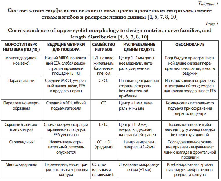 Опросно-морфологическое исследование выделило десять конфигураций складки века: одиночное веко, параллельный двустворчатый вариант, веерообразный, параллельно-веерообразный, раскрытый веерообразный, серповидный, скрытый, горизонтальный, треугольный и многоскладчатый. Половые различия статистически подтверждены; по предпочтениям чаще выбирают параллельно-веерообразный и параллельный тип. Перевод типологии в рабочие переменные сводится к связи высоты демонстрации тарзальной площадки и наклона щели с требуемым вектором подъёма пучка: при низкой демонстрации и нависании передний участок дуги лучше строить на базе L-семейства с положительным базальным плечом; при открытом веерообразном достаточно C/CC с умеренным подъёмом; при высоком параллельном избыточная кривизна даёт тень в зоне зрачка [1, 10].