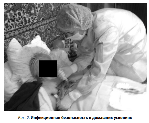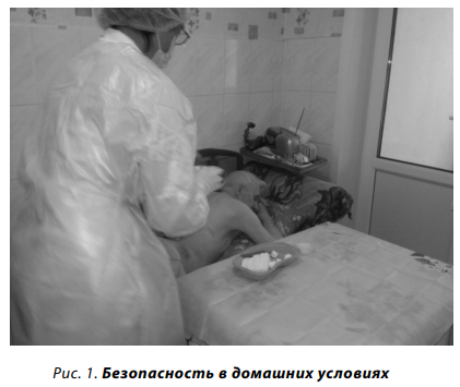 Инфекционная безопасность в домашних условиях — это прежде всего использование средств индивидуальной защиты, одноразовых инструментов медицинского назначения, расходных материалов. Родным пациента с тяжелой симптоматикой и ранами различной этиологии медицинская сестра, основываясь на стандартных операционных процедурах, разработанных в онкодиспансере, рассказывает о правилах пользования средствами индивидуальной защиты, правилах санитарно-эпидемического режима в домашних условиях, режиме проведения уборки в домашних условиях, смене постельного и нательного белья, принципах ухода за раневой поверхностью, правилах утилизации и обеззараживания отработанного материала. Медицинская сестра показывает правильную гигиеническую обработку рук при проведении различных манипуляций в соответствии со стандартом.