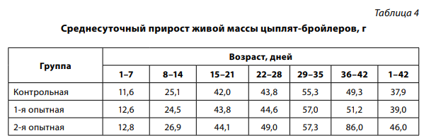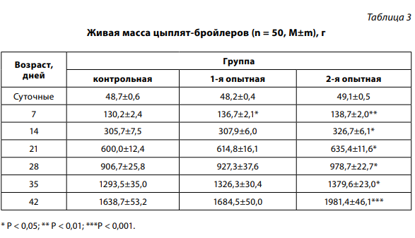 Так, в 42-дневном возрасте живая масса цыплят 2-й группы превысила контрольную и 1-ю на 342,7 и 296,9 г соответственно.