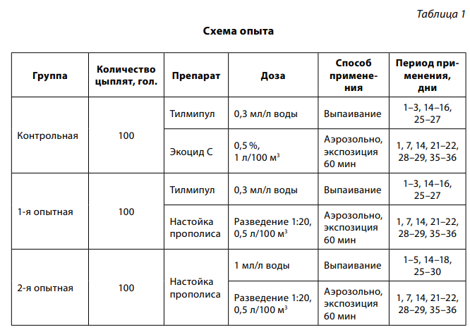 Для реализации поставленной цели из суточных цыплят-бройлеров кросса Росс-308 по принципу аналогов скомплектованы контрольная и две опытные группы по 100 голов в каждой, размещенные в отдельных изолированных помещениях. Для профилактики респираторной инфекции применяли препараты в соответствии со схемой опыта (табл. 1).
