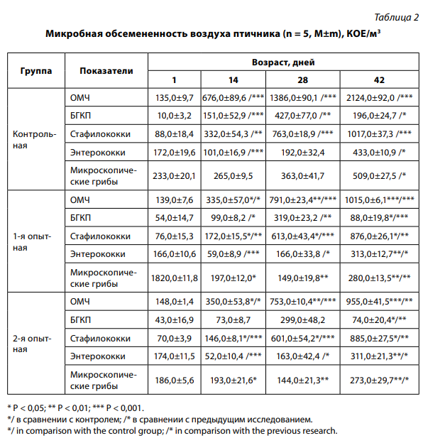 На 42-й день опыта прослеживалась та же тенденция, при этом ОМЧ в 1-й группе ниже на 1109, во 2-й – на 1169 КОЕ/м3 по сравнению с контролем в этот же период.
