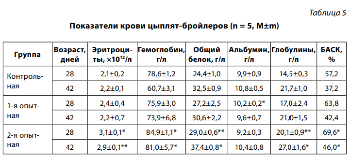 Количество эритроцитов в крови цыплят 2-й группы в возрасте 42 дня превысило контрольную и первую группы на 0,7х1012/л, содержание гемоглобина – на 20,3 г/л по сравнению с контрольной и на 7,1 г/л – с 1-й (табл. 5).
