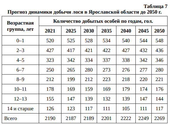 Прогноз динамики добычи лося в Ярославской области до 2050 г. представлен в табл. 7.