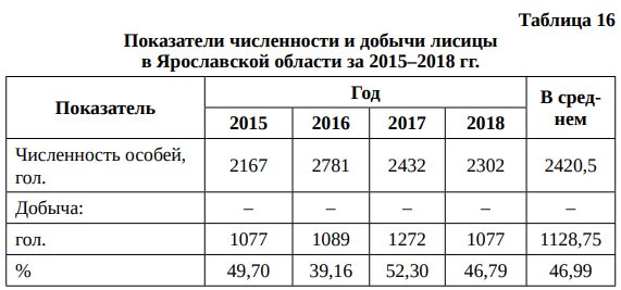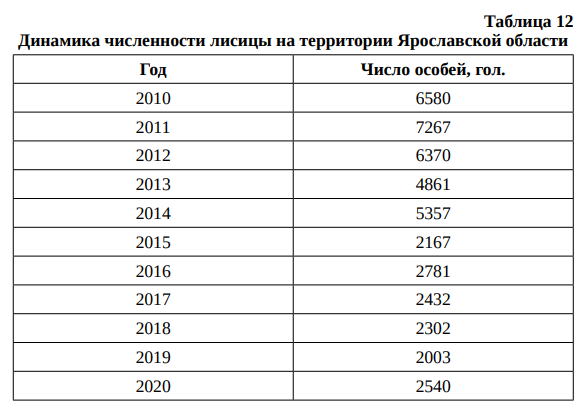 Динамика численности популяции лисицы в Ярославской области характеризуется регрессивным и неустойчивым характером. За 2010–2020 гг. численность лисицы снизилась с 6580 до 2540 особей, а в 2015, 2017, 2018 и 2019 гг. наблюдались провалы в динамике численности.