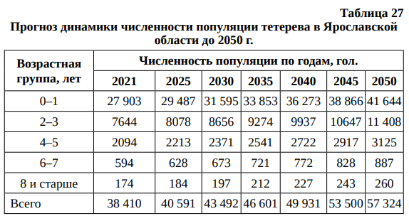 Прогноз динамики численности популяции тетерева в Ярославской области до 2050 г. представлен в табл. 27.