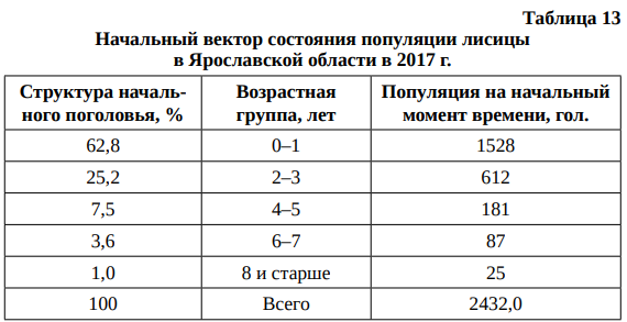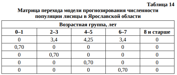 Настройка алгоритма модифицированной матричной модели на примере прогнозирования динамики популяции лисицы в Ярославской области выглядит следующим образом (табл. 13–16).
