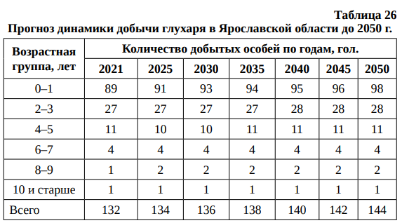 Прогноз динамики добычи глухаря в Ярославской области до 2050 г. приведен в табл. 26.