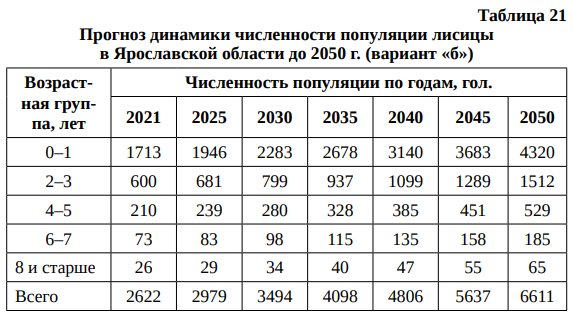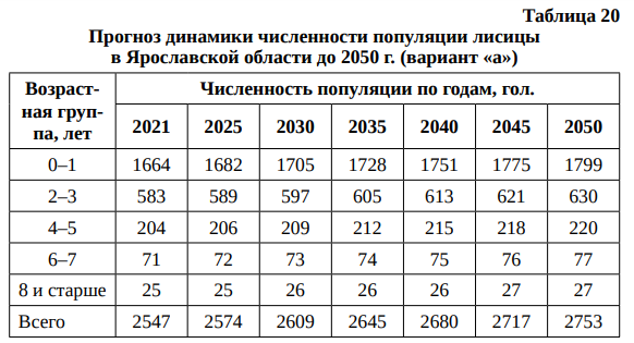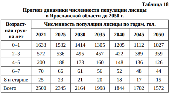Верифицированная матричная модель прогнозирования численности популяции лисицы в Ярославской области применена для расчетов численности динамики популяции лисицы до 2050 г. (табл. 18).