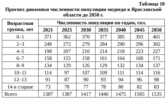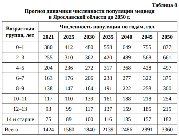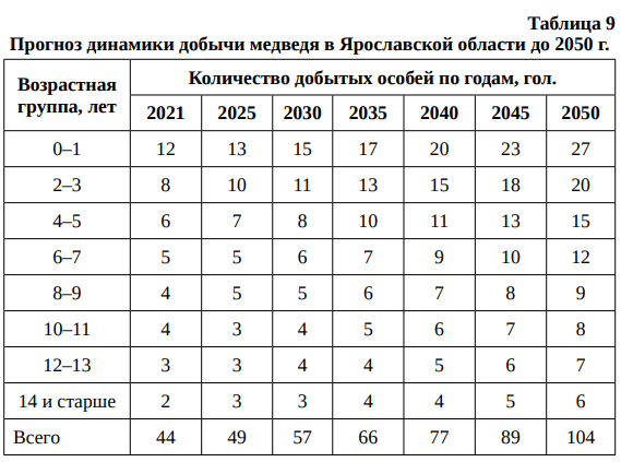 Прогноз динамики добычи медведя в Ярославской области до 2050 г. (при уровне добычи 3 %) представлен в табл. 9.