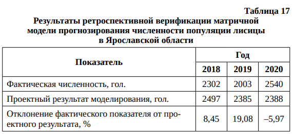 Результаты ретроспективной верификации матричной модели прогнозирования численности популяции лисицы в Ярославской области отражены в табл. 17.